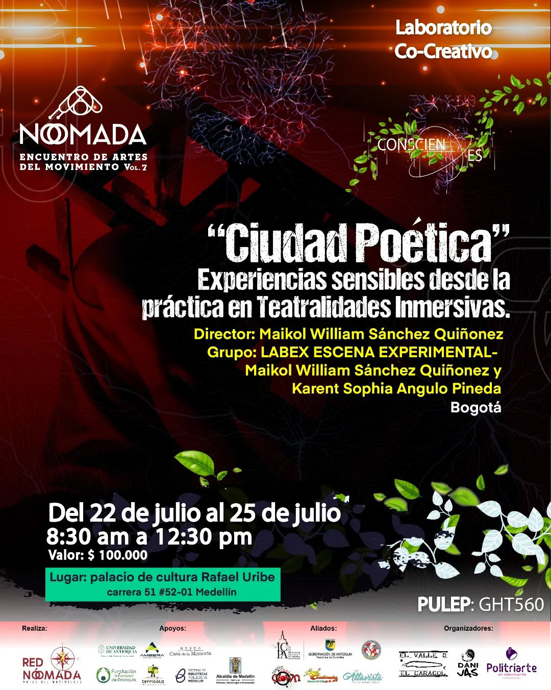 Laboratorio de co-creación escénica en artes interdisciplinares (Danza,Teatro y Multimedia) que toma el concepto de "ciudad Poética" y sus narrativas culturales, como una reflexión estética sobre la construcción en las relaciones sociales y el tejido social con los entornos urbanos. Reconociendo la ciudad como un escenario Vivo. Encuentro Nómada Artes del Movimiento Vol.7 "Conscien7es"